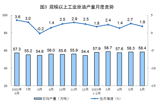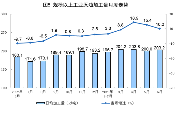 原油生產(chǎn)保持平穩(wěn),進口快速增長,原油加工較快增長。上半年,生產(chǎn)原油10505萬噸,同比增長2.1%。進口原油28208萬噸,同比增長11.7%。加工原油36358萬噸,同比增長9.9%。6月份,生產(chǎn)原油1752萬噸,同比增長1.9%。加工原油6095萬噸,同比增長10.2%。
