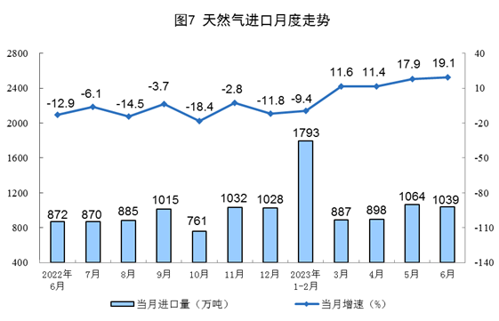 天然氣生產(chǎn)平穩(wěn)增長,進口增速較快。上半年,生產(chǎn)天然氣1155億立方米,同比增長5.4%。進口天然氣5663萬噸,同比增長5.8%。6月份,生產(chǎn)天然氣183億立方米,同比增長5.5%。